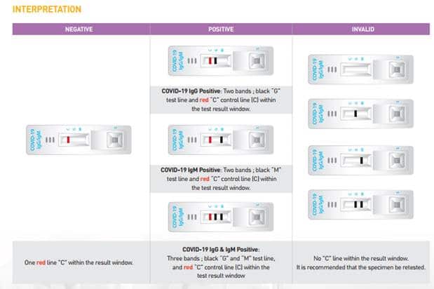 - Sistema de color dual fácil de usar (línea de control: rojo, línea de prueba para IgG / IgM: negro)