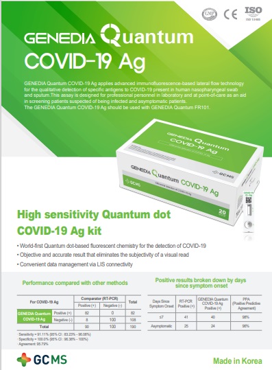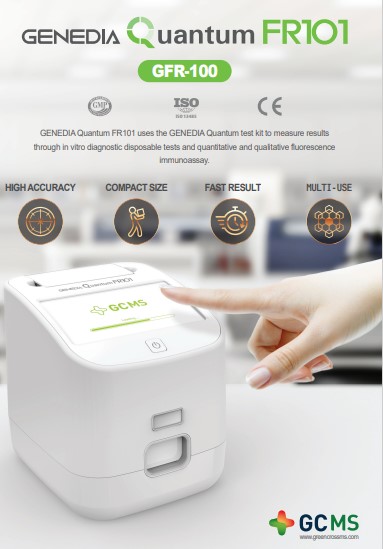 Genedia Quantum es el sistema más avanzado para realizar test de antígenos, el kit está formado por los test Quantum COVID-19 Ag y el analizador Quantum FR101. Esta innovadora tecnología FIA (fluorescence immunoassay antigen) utiliza un sistema de inmunoensayo cuantitativo basado en tecnología microfluídica y de inmunofluorescencia. Este tipo de tecnología es es similar a las de tipo RTPCR empleadas para medir tasas de generación.